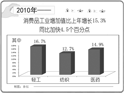 工业和信息化部公布的数据显示,2010年,我国消费品工业继续保持平稳较快运行态势,效益状况明显改善,外贸出口持续回升。全年工业增加值比2009年增长15.3%,同比加快4.5个百分点,其中轻工、纺织、医药工业增加值比上年分别增长16.7%、12.7%和14.9%。