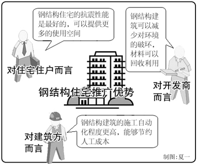 要从建设流程的规范上对钢结构住宅倾斜,完善相关经济制度,形成鼓励发展节能省地环保型建筑、绿色建筑及可再生能源建筑应用的财税等政策体系,使推广钢结构住宅落到实处。