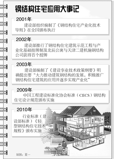 我国第一部关于钢结构住宅的规范——《轻型钢结构住宅技术规程》JGJ209于2010年4月17日由住房和城乡建设部颁布了,该规程是在总结和分析了我国多年来钢结构住宅工程实践、并做了大量的科学试验和调查研究的基础上,提出了一种符合中国国情的、与国家现行标准保持一致的“轻型钢结构住宅”新体系。规定了轻型钢结构住宅建筑的功能和性能,给出了轻型钢结构住宅的材料标准、设计施工和验收技术要求以及使用和维护的规范管理原则。该“规程”的颁布,不仅用以规范我国轻型钢结构住宅的工程实践,而且对企业开发新型墙体材料和建筑节能新体系具有指导作用。