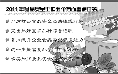 为巩固前一阶段食品安全整顿成果,进一步突出重点,明确责任,强化集中治理和日常监管,促进食品安全水平不断提高,2011年食品安全重点工作主要有以下五个方面的安排:
