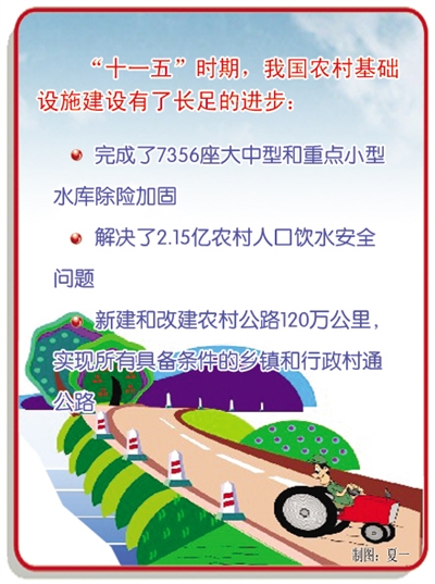 农村基础设施建设在“十一五”时期得到了较快发展,但很多薄弱环节仍长期制约着我国农村经济社会的发展。马晓河认为,“十二五”规划纲要虽然和“十一五”规划纲要一样,都用专门一节强调“加强农村基础设施建设”,但“十一五”规划纲要的这一节着眼点是农民最急需的生产生活设施建设,比如农村公路建设、完善农村电网、村村通电话、乡乡上网。如今,这些目标基本实现,因此,“十二五”规划纲要提出了更高的要求。