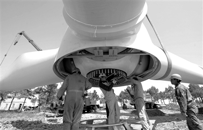 3月25日,电力工程技术人员在安徽省来安县杨郢风力发电场对准备安装的风电设备进行检查。当日,安徽目前最大容量的风电场——来安县杨郢风电场第四期工程完成33台风机安装。 宋卫星摄(新华社发)