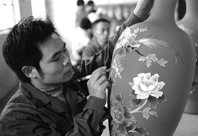 河南省汝南县一笑堂麦草工艺瓶有限公司的员工们正在精心制作麦草工艺瓶。当地研制的陶瓷麦草画工艺瓶目前已研发出6大系列300多个品种,产品畅销国内外市场。 本报记者 李景录摄
