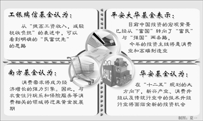 此外,平安大华基金表示,目前中国投资的宏观背景已经从“富国”转向了“富民”与“强国”两条路,今年的投资主线将是消费业和高端制造业。华安基金也认为,在“十二五”规划纲要的大方向下,新兴产业、消费升级以及传统行业中的技术升级行业将面临全新的投资机会。