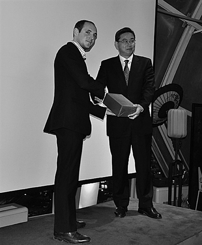 第十届“汉语桥”世界大学生中文比赛比利时赛区决赛于日前在比利时著名世博建筑原子球落下帷幕。经过激烈角逐,来自鲁汶大学汉语系大四的学生文森特最终获得冠军。图为文森特上台领奖。 本报驻布鲁塞尔记者 严恒元摄影报道