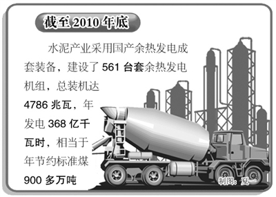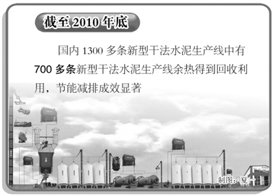 新型干法水泥窑纯低温余热发电是一项将水泥窑中低温废气余热转化为电能的节能技术,可有效提高水泥生产过程中的能源利用效率,降低能源消耗,减轻环境热污染。数据显示,截至2010年底,我国新型干法生产线已经达到1080条左右,除已建和在建外,还有约40%的生产线可以配置余热发电装置。如果以上新型干法熟料线全部配套余热发电,每年可实现节电270亿千瓦时,相当于节约煤炭消耗1000万吨,共减排二氧化碳约2360万吨。