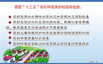 我国“十二五”农村环境保护的目标还包括:农村饮用水水源地水质状况和管理状况得到改善,农村生活污水和生活垃圾处理、规模化畜禽养殖场、散养密集区污染治理水平显著提高,农村土壤环境保护和农业面源污染防治得到加强,农村环境质量初步改善,农村环境监管能力和农民群众环保意识明显提升。