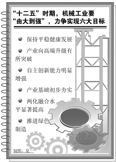 本报北京3月29日讯 记者李会报道:中国机械工业联合会今天发布的《“十二五”机械工业发展总体规划》提出,“十二五”时期,我国机械工业要“由大到强”,力争到“十二五”末实现6大目标。