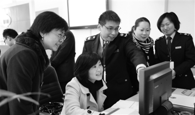 4月2日,在四川丹棱县国税局办税服务厅,市民代表在税务人员指导下参加体验活动。今年4月是第20个全国税收宣传月。当日,四川丹棱县国税局开展“国税开放日”零距离办税体验活动。 姚永亮摄(新华社发)