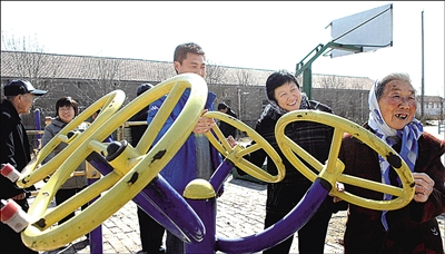 图3 无棣县埕口镇东北村农民文化广场,村民们正在进行健身活动。目前,无棣县有80%的村建起了文化广场,篮球场、健身器材及农家书屋等一应俱全。