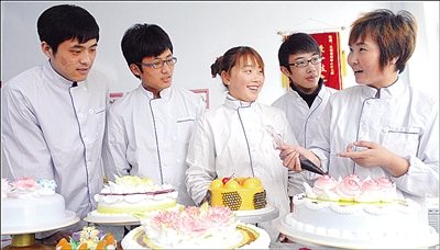 图4 无棣县劳动就业处举办的培训班上,农民工在学习蛋糕制作。目前通过各种培训已有225人成功创业,安置1000余人就业。以创业带动就业,是解决民生问题的新思路之一,正在推广实施。