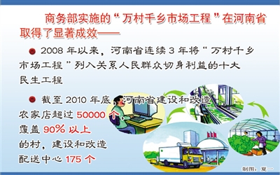 2005年起,商务部实施的“万村千乡市场工程”在河南取得了显著成效。河南省商务厅副厅长魏国庭介绍说,河南省委、省政府高度重视这项惠民工程,2008年以来连续3年将“万村千乡市场工程”列入关系人民群众切身利益的十大民生工程,省财政每年从预算资金中安排配套资金支持,为深入实施“万村千乡市场工程”提供了强有力的政策支持和保障,“万村千乡市场工程”实施以来,中央财政及省财政共拨付资金4.53亿元,带动民间投资近70亿元。