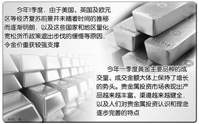 而且随着行情的向好,今年一季度贵金属投资市场表现出产品越来越丰富、渠道越来越健全,以及人们对贵金属投资认识和理念逐步完善的特点。
