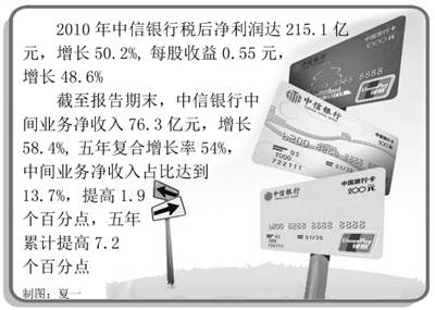在收入结构调整方面,中信银行大力推动中间业务发展。截至报告期末,中信银行中间业务净收入76.3亿元,增长58.4%,五年复合增长率54%,中间业务净收入占比达到13.7%。