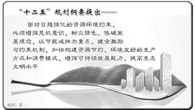 “十二五”规划纲要提出,面对日趋强化的资源环境约束,必须增强危机意识,树立绿色、低碳发展理念,以节能减排为重点,健全激励与约束机制,加快构建资源节约、环境友好的生产方式和消费模式,增强可持续发展能力,提高生态文明水平。