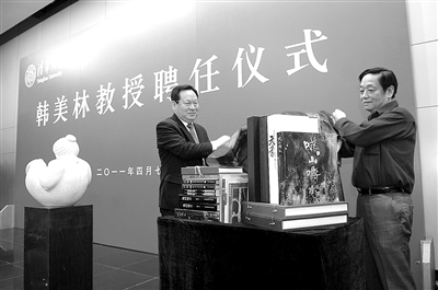 本报讯 记者马洪超报道:当代著名艺术家韩美林受聘清华大学教授仪式日前在清华大学举行。聘任仪式上,清华大学校长顾秉林向韩美林颁发教授聘书,韩美林将他的雕塑作品《母与子》、水墨画作品《骏马图》以及著作赠送给清华大学。