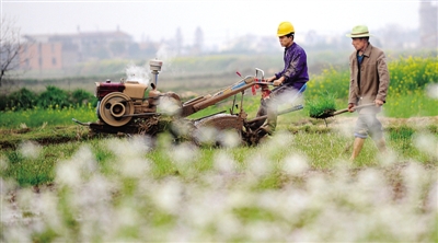 江西新建县象山镇象山村村民在早稻田里耕作(4月8日摄)。 江西省春耕生产目前正在全面展开。据江西省农业部门预计,今年江西全省早稻机耕面积将达1770万亩,早稻机插面积将达290万亩。今年江西将进一步强化增产丰收措施,努力实现粮食总产八连增。新华社记者 周 科摄