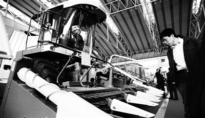 4月9日,参观者在中国黑龙江畜牧产业博览会上观看一台自走式青贮收获机。当日,2011中国·黑龙江畜牧产业博览会在哈尔滨国际会展体育中心开幕,许多先进的农业机械在本次展会上亮相。 张清云摄 (新华社发)