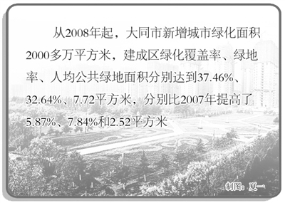 大同市园林局局长王建宝告诉记者,从2008年以来,大同市委、市政府动员全社会力量,大力实施规划造绿、拆违建绿、见缝插绿、补植增绿、立体绿化,进行公园建设,道路、庭院、居住区等附属绿地建设和环城防护绿地建设等一系列绿化工程建设。全市新增城市绿化面积2000多万平方米,建成区绿化覆盖率、绿地率、人均公共绿地面积分别达到37.46%、32.64%、7.72平方米,分别比2007年提高了5.87%、7.84%和2.52平方米,使“林在城中,城在林中,树成林,花成片,绿成景”的梦想变成现实。