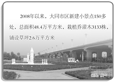 2008年伊始,大同市历史上规模最大的名城保护修复工程全面拉开。在规划建设名城保护修复工程中,大同市政府要求城市绿化要同步进行,城市各角要“见缝插绿”,在市区内,凡是有空闲的地方,全部种草植树,街道拐角处、社区街道旁、居民住宅区、单位庭院内,巧妙地把绿化与美化有机结合,让绿色景点成为连接空间与人群的纽带。据统计,2008年以来,市区新建小景点150多处,总面积48.4万平方米,栽植乔灌木3133株,铺设草坪2.6万平方米,达到市区范围无裸地、无空地。与此同时,各单位开展园林化达标争先创优活动,各社区街道开展绿化美化评比竞赛,各开发建设项目严格执行“绿色图章”制度,新建居民住宅小区绿地面积必须达30%以上,使全市441家单位和小区达到园林化标准。