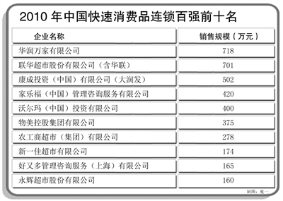 以超市为代表的快速消费品百强企业,2010年的销售额和门店数量增幅分别为13.8%和4.5%(剔除个别特殊情况),店铺增幅低于2009年,但销售增幅比2009年有所提高(2009年分别为10.2%和9.5%),显示出经营质量的改善。