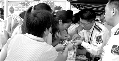 下图 广东省质监部门工作人员向群众传授鉴别假冒伪劣产品的知识。