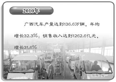 本报讯 记者周骁骏 童政报道:“十一五”期间,广西汽车工业实现了又好又快发展。“好”在于汽车产业的档次、技术水平上有新的突破。上汽通用五菱的“宝骏630”中级轿车的正式投产,标志着广西汽车工业迈上了一个新的台阶。另外,桂林客车集团公司自主研发的纯电动公交车,在南宁、桂林两市投入运营,并被指定为上海世博会的专用车,这也标志着广西的新能源汽车迈出了坚实的步伐。“快”则在于2010年广西的汽车产量达136.6万辆,年均增长32.3%,销售收入达到1262.6亿元,增长31.6%,继食品产业之后成为广西第二个千亿元产业。此外,零部件配套体系也进一步完善,整个行业的竞争优势进一步凸显,圆满完成了广西汽车产业“十一五”规划的所有目标。