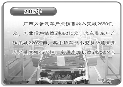 广西将通过以上措施,全力推进汽车产业结构优化升级,力争到2015年,汽车产业销售收入突破2650亿元,实现工业增加值650亿元;汽车整车年产销突破220万辆,其中轿车及小型多功能乘用车产量突破45万辆;车用内燃机达到300万台。