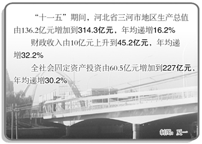 本报讯 记者雷汉发、通讯员兰海波报道:“十一五”期间,河北省三河市地区生产总值由136.2亿元增加到314.3亿元,年均递增16.2%;财政收入由10亿元上升到45.2亿元,年均递增32.2%;全社会固定资产投资由60.5亿元增加到227亿元,年均递增30.2%。为什么没有任何资源优势的三河市能够实现高质量的快速发展,连续六年入围“全国百强”县市?市委书记李刚回答说:“这在很大程度上得益于三河市深入贯彻落实科学发展观,注意用理念创新带动行为创新,促进区域经济实现了重点突破。”