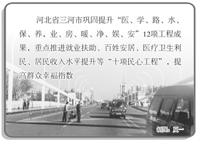 树立“保民生是经济持久发展的原动力”的理念,在改善民生上求突破。三河市全心全意谋民利,继续巩固提升“医、学、路、水、保、养,业、房、暖、净、娱、安”12项工程成果,重点推进就业扶助、百姓安居、医疗卫生利民、居民收入水平提升“十项民心工程”,提高群众幸福指数。同时,三河市把信访工作引入科学化、规范化轨道,使化解群众信访的过程成为密切党群干群关系、促进社会和谐的过程。