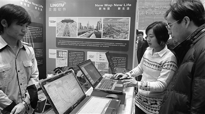 上图:地理信息系统软件技术的进步,促进了产业的发展。图为在卫星导航展示会上,观众正在体验地理信息在卫星导航领域中的应用。 本报记者 徐 红摄