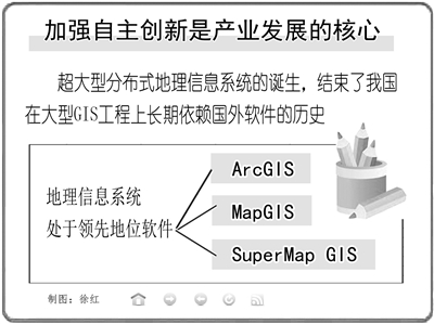 在激烈的市场竞争中,国产GIS企业如何抓住机遇,促进产业发展,这是国产GIS企业所面临的一个重大课题。刘永认为,加强自主创新能力建设是产业发展的核心。GIS产业链“两头大,中间小”,上游的数据量和下游的信息服务均大于中间的软件研发。在国内市场中,ArcGIS、MapGIS和SupGIS这三种先进的软件所占据的市场总和不到5%。因此,要想获得更大的发展,就要从技术、运营模式、机制和体制等诸多方面创新。