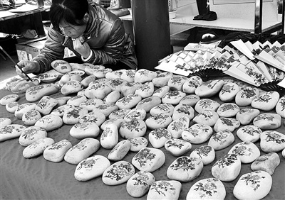 4月11日,在洛阳市内的一个旅游景点,一名艺人在现场绘制牡丹画石工艺品。近年来,洛阳市重视牡丹产业的开发与推广,抓住商机,精心打造“牡丹经济”,使牡丹旅游产品成为洛阳的新名片,各种各样包含牡丹元素的旅游产品深受中外游客的欢迎。 新华社记者 王 颂摄