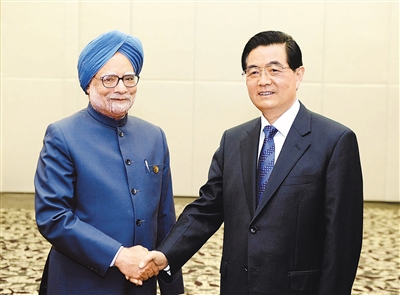 胡锦涛指出,中国和印度互为重要邻国,也都是新兴市场国家。去年4月以来,中印关系保持健康稳定发展势头。双方成功举办纪念中印建交60周年系列活动,两国各领域交流合作不断深化,双方在重大全球性问题上保持密切沟通和协调。在当今国际形势深刻变化的背景下,中印关系的全球和战略意义更加突出,两国关系发展面临广阔前景。
