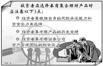 国信证券文伟认为,投资者在选择券商集合理财产品时应注意以下3点:首先,投资者要根据自身的风险承受能力和资金实力来选择。如果是以资产的保值增值为目的,应该选择限定性产品;如果是以追求高收益为目的,则应该选择非限定性产品。其次,投资者要考察产品的历史业绩。不能只看该产品最近一年的收益,还应考察其在牛市与熊市中的综合表现。如果是新成立的产品,则应考察其投资经理曾经管理过的产品的表现。再者,投资者要考察证券公司资产管理团队的综合实力。考察证券公司过去是否有成功的集合理财产品运作经验,业绩如何,管理团队人员是否稳定等。稳定而优秀的管理团队,是一只券商集合理财产品取得成功的保障。
