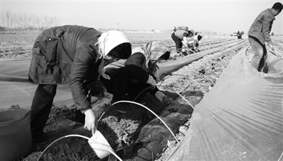 春回大地,华北平原气温开始回升,农民们不失时机地进行农业耕种。图为河北省大城县大尚屯镇田庄村农民在种植优质西瓜。 本报记者 宋美倩 通讯员 张俊英摄影报道