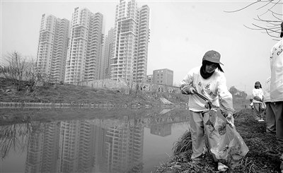 日前,湖南长沙市开展“保护圭塘河”河流清污活动,来自学校、社区的400多名志愿者在圭塘河沿线对河面以及河岸的生活垃圾等固体污染物进行了清理。 新华社记者 李 尕摄