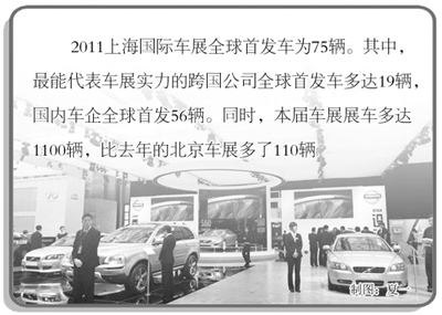 和大众汽车一样,本次车展无论国外还是国内车企,都竞相推出了自己的首发车型。据统计,此次车展全球首发车为75辆。其中,最能代表车展实力的跨国公司全球首发车多达19辆,国内车企全球首发56辆。在这些首发新车中,包括雪佛兰Malibu迈锐宝、别克概念SUV、奥迪新一代A6L、奔驰改款C级、新CLS、新SLK、宝马新一代6系Coupe、大雪铁龙DS5概念版、东风标致508、雷诺Fluence风朗、保时捷Panamera混合动力版等重磅新车和概念车,其中不少也是从今年日内瓦车展转场上海在中国首发。