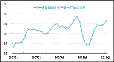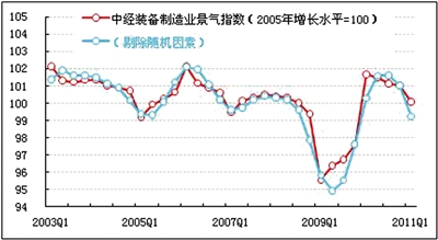 景气:2011年一季度中经装备制造业①景气指数为100.1点(2005年增长水平=100②),比上季度回落0.9点,这是自2010年二季度以来连续第四个季度出现回落。
