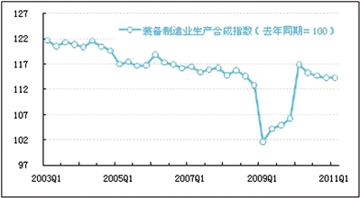 经初步季节调整,2011年一季度,我国装备制造业生产合成指数为114.3点(去年同期=100),与2010年四季度基本持平。装备制造业各子行业的生产增速均高于全部工业14.1%的平均增速。其中,专用设备制造业生产增长最快,通用设备制造业次之,通信设备、计算机及其他电子设备制造业增长相对较慢。