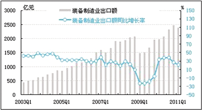 2011年一季度,装备制造业出口交货值占装备制造业产品销售收入的比重为25.2%,仍未恢复到国际金融危机前的水平(30%以上)。以上数据表明,推动装备制造业较快增长的主要动力是国内需求的拉动。