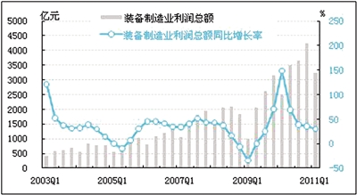 经初步季节调整,2011年一季度,装备制造业实现利润总额为3242.9亿元,同比增长29.8%,同比增速较2010年四季度回落5.2个百分点。在装备制造业的子行业中,金属制品业、通用、专用设备制造业的利润增长超过全部工业的平均利润增长水平(31%)。