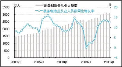 2011年一季度末,装备制造业从业人员数为3118万人,同比增长12.7%,同比增速比上季度回落0.7个百分点。装备制造业各子行业从业人员增速均快于全部工业平均增长率。其中,仪器仪表及文化、办公用机械制造业从业人员增长最快,电气机械及通信设备、计算机及其他电子设备制造业次之。