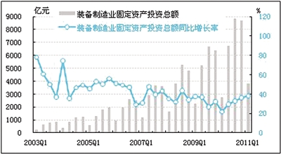 经初步季节调整,2011年一季度,装备制造业固定资产投资总额为3829.7亿元,同比增长38.4%,同比增速较2010年四季度加快2.4个百分点。在装备制造业的子行业中,除金属制品业之外,其他子行业的投资同比增速均高于全部工业平均水平,尤其是通信设备、计算机及其他电子设备制造业的增长速度最快,电气机械及器材制造业次之。