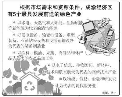川渝两地专家分析认为,根据市场需求和资源条件,成渝经济区有5个最具发展前途的绿色产业,即:以水电、天然气和太阳能、生物质能等新能源为代表的清洁能源;以发电设备、输变电设备、重型装备、石油钻采设备和交通运输设备为代表的装备制造业;以饮料、粮油、果蔬、肉制品和林产品为代表的农产品加工业;以电子信息、生物医药、新材料、核技术和航空航天为代表的高新技术产业;以物流、信息、金融和研发设计为代表的现代服务业。