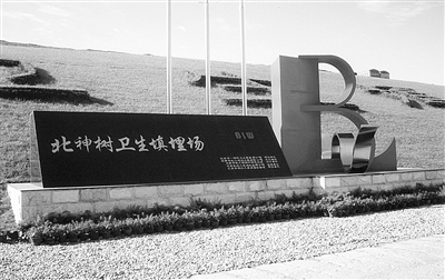 上图:北京北神树垃圾卫生填埋场占地面积32.5公顷,平均日处理垃圾1200吨。运到这里的生活垃圾由垃圾转运车倾倒在绿色小山山顶的工作面上,随后由推土机将垃圾打散推平,再由巨型碾压机将垃圾压平、夯实。