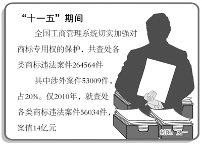 据统计,“十一五”期间,全国工商管理系统切实加强对商标专用权的保护,共查处各类商标违法案件264564件,其中涉外案件53009件,占20%。仅2010年就查处各类商标违法案件56034件,案值14亿元。