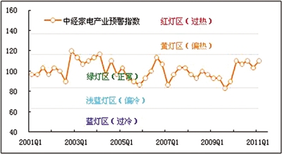 预警:2011年一季度,中经家电产业预警指数为110.0点,较上季度上升6.7点⑥,连续五个季度运行于“绿灯区”中心线以上。