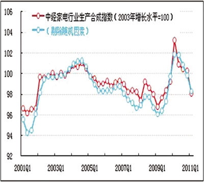 2011年一季度,家电行业生产合成指数为98.1点(2003年增长水平=100),比上季度回落了2.2点。在构成家电行业生产合成指数的4个指标中,经季节调整剔除季节因素后,空调产量同比增速较上季度有所加快,电冰箱、洗衣机、彩电产量同比增速较上季度有所回落。