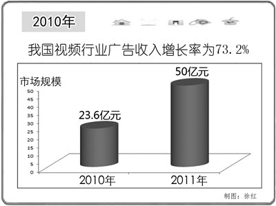 和电视不同,对于视频网站来说,不存在所谓的黄金时段,所以每一分钟都可以有上万人次甚至更多的点击率。这种时间上的互动优势,就成了视频网站的最大优势。视频网站56网营销副总裁李浩表示,广告主对视频网站的关注越来越多,其中快速消费品行业客户对视频网站的接受度更高,并具有很强的带头作用。数据显示,2010年我国视频行业广告收入增长率为73.2%,市场规模达到23.6亿元。预计2011年将大幅增长至50亿元。